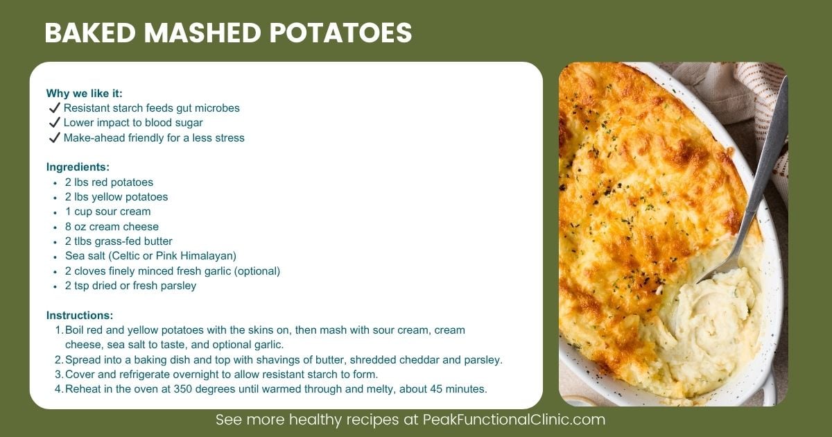 Bottom line: You don’t have to skip your favorite traditions to be health-conscious. With a little planning and awareness, you can enjoy your favorite sides and support your long-term metabolic and gut health. A bowl of reheated, thoughtfully made mashed potatoes? That’s a holiday win, for your soul, and for your microbiome.